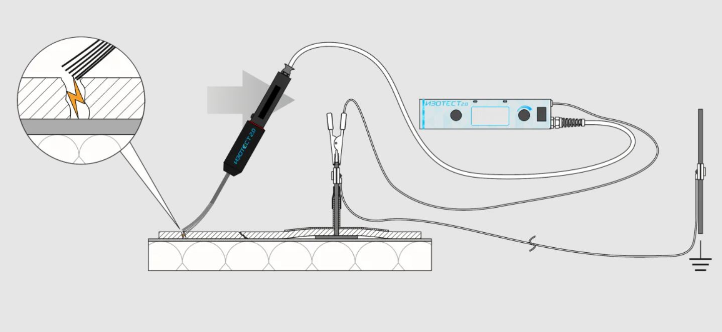 Прибор создаёт электрическое поле на поверхности кровли. В местах повреждений (проколы, разрывы, непроваренные швы) происходит электрический пробой. Специальный сканер фиксирует место дефекта с точностью до 1 м².